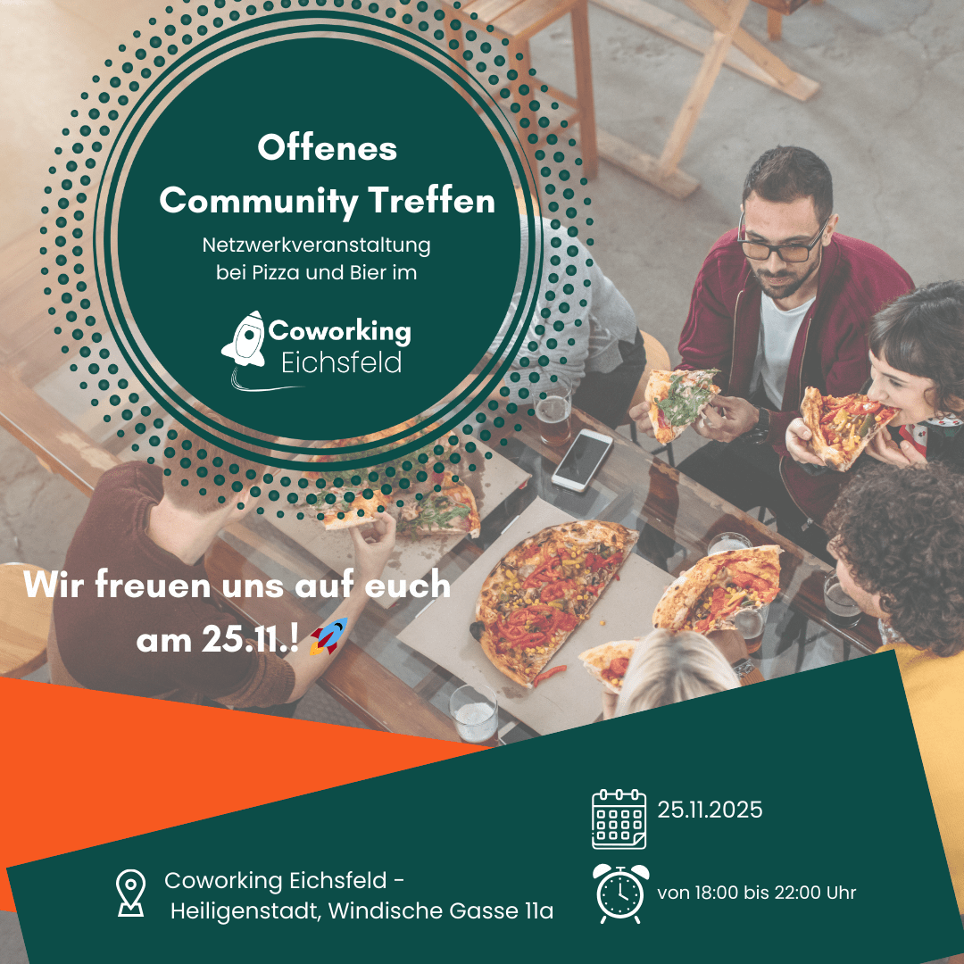 Jeden letzten Dienstag im Monat öffnen wir ab 18:00 Uhr die Türen von Coworking Eichsfeld, um diese Vernetzung mit Bier und Pizza zu verwirklichen.