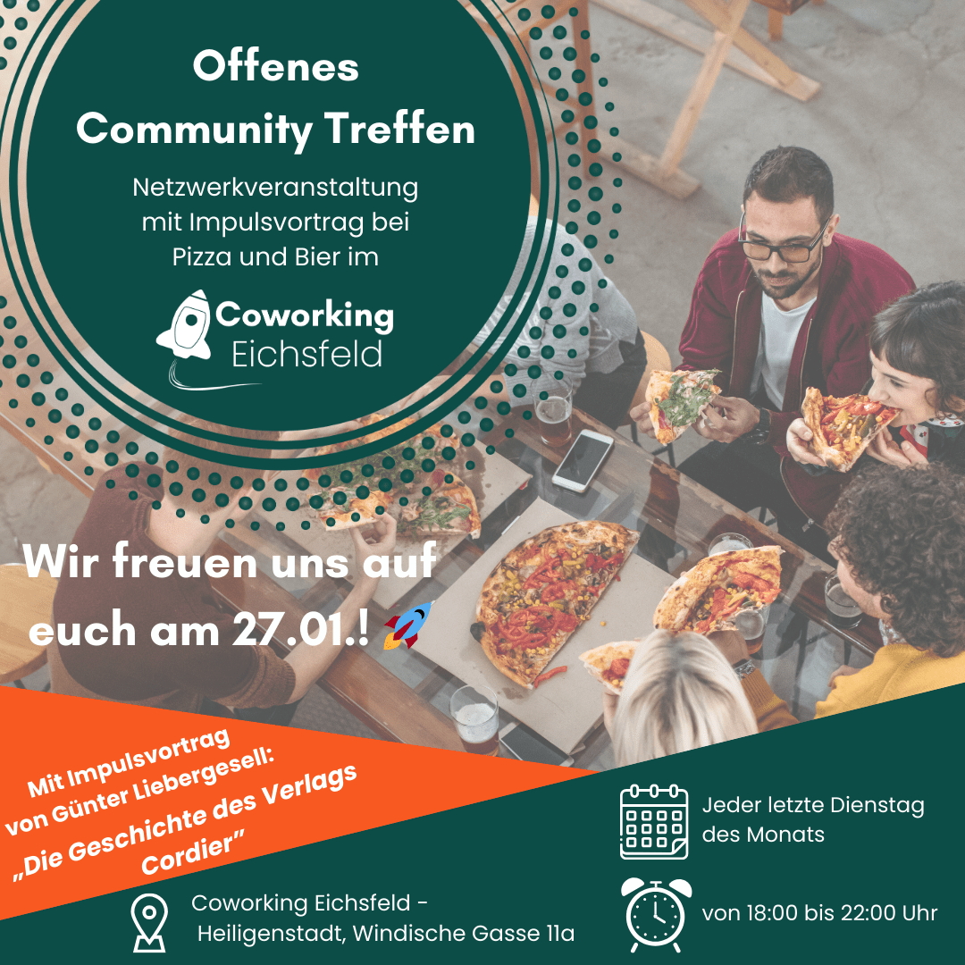 Jeden letzten Dienstag im Monat öffnen wir ab 18:00 Uhr die Türen von Coworking Eichsfeld, um diese Vernetzung mit Bier und Pizza zu verwirklichen.